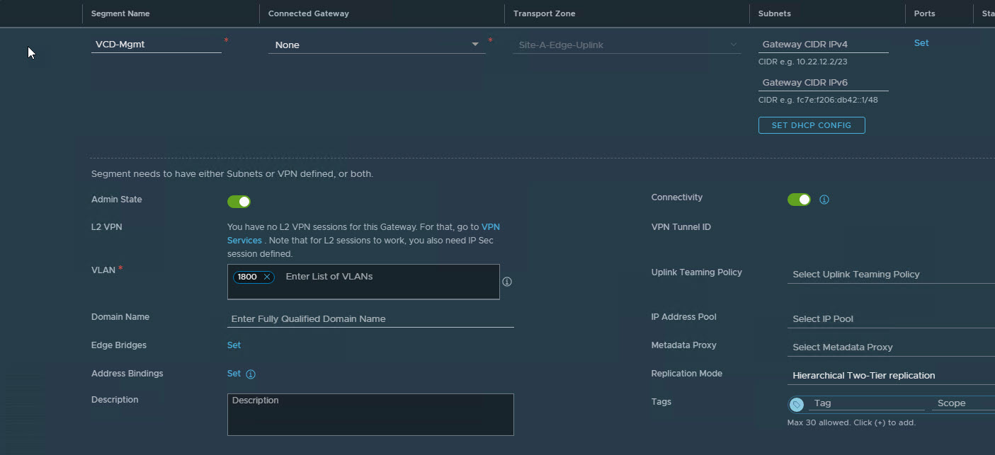 - The VLAN ID for this segment will be the same as configured for the VDS port group where VCD cells are connected.