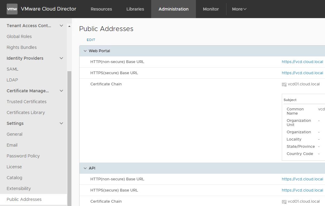 The last step is to change the public URL of VCD to point to the hostname of the VIP defined for VCD.