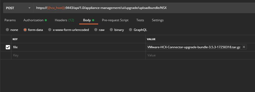 Method:POST URL:https://<hcx-manager-fqdn>:9443/api/1.0/appliance-management/ui/upgrade/uploadbundle/NSX Body:form-data,Key:file,value:'Upgrade Bundle File Name' |