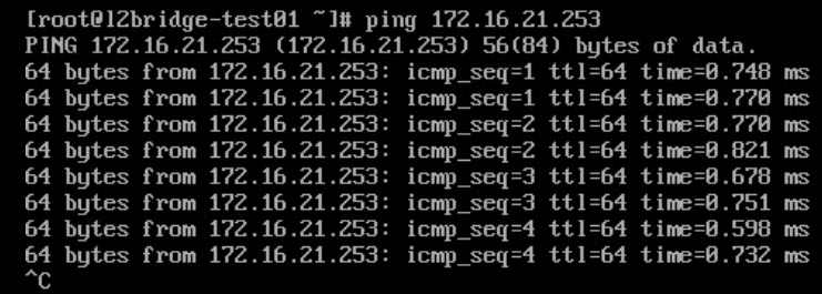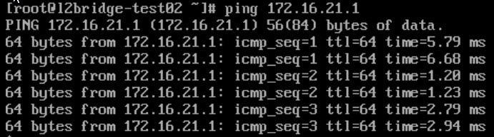 From L2-Bridge-Test02 VM, I pinged 172.16.21.1 IP which is the default gateway of the VLAN network and exists on my Top of rack switch. Got successful ping response.