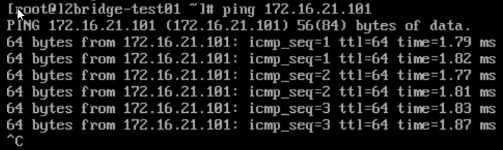 From L2-Bridge-Test01 VM I pinged 172.16.21.253 IP which is the default gateway of overlay segment and ping test passed.