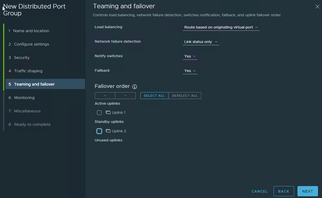 Set teaming policy for this port group to explicit failover order choosing one uplink as active and the other as standby.