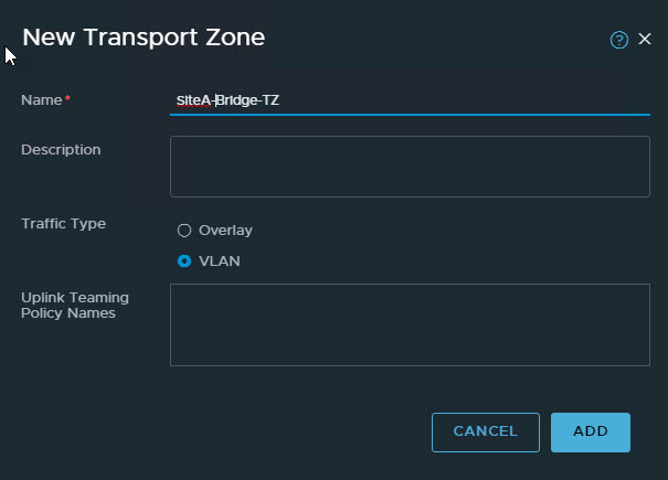 Create a new VLAN Transport Zone for edge bridging. This transport zone will be added to Edge VMs in the next step.