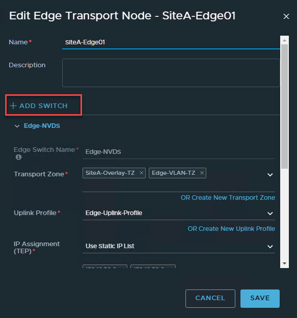 Bridging between the physical and virtual networks is performed via Edge nodes, so we must add edges to the bridge transport zone which we just created.