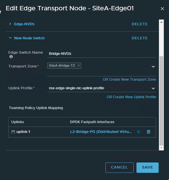 For Uplink Profile, select nsx-edge-single-uplink-profile, and under uplink mapping, map the edge uplink to the trunk port group created in Step-1.