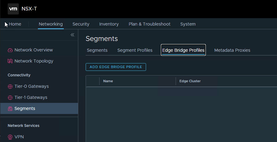 To create an Edge Bridge Profile, navigate to Networking > Connectivity > Segments > Edge Bridge Profiles and click on Add Edge Bridge profile.