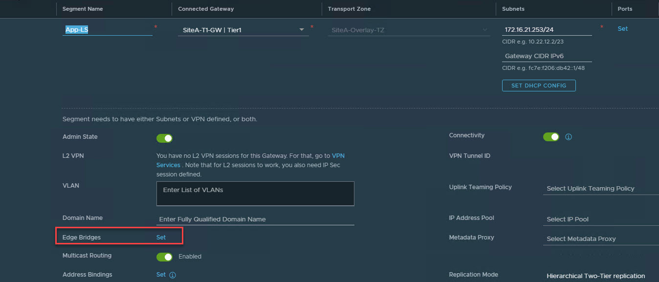 To associate an overlay segment with a bridge profile, edit the settings of the segment and click on Set under Edge Bridges.
