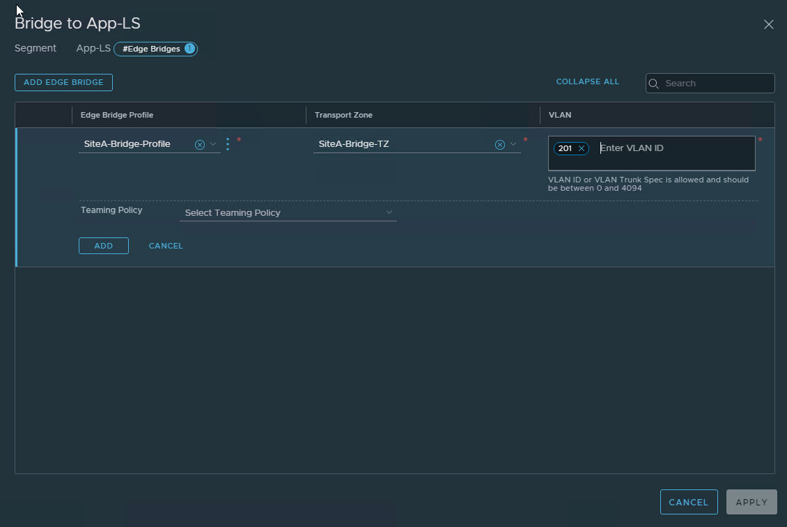 Click on Add Edge Bridge and select the profile created in Step-5. Also, select the bridge transport zone which we created earlier.