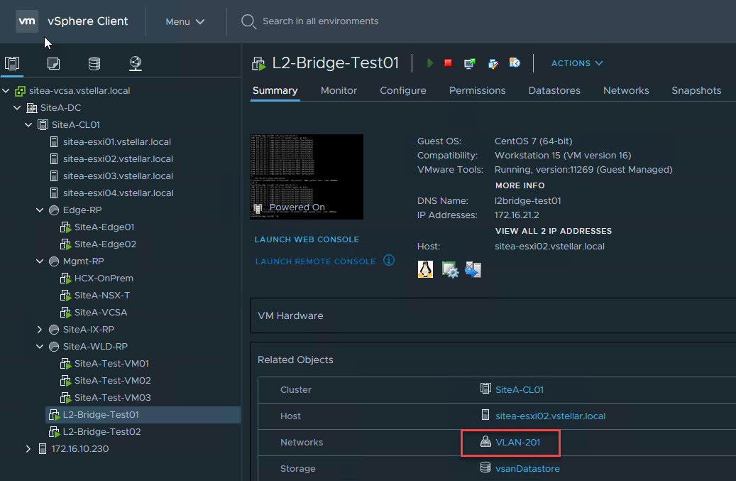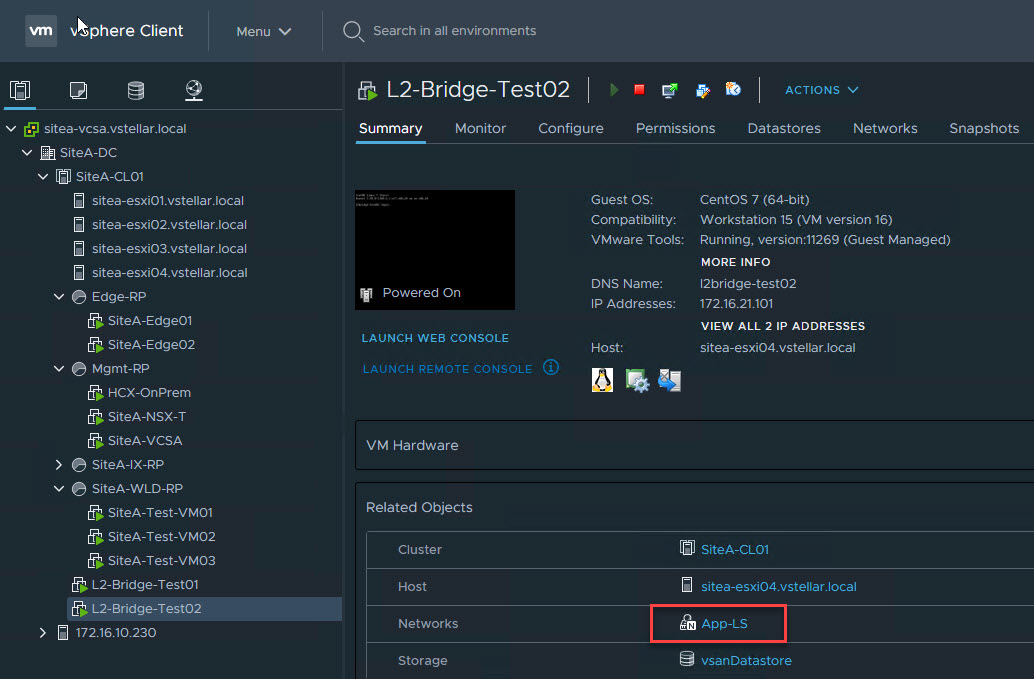In vSphere, I have 2 VMs namely L2-Bridge-Test01 & L2-Bridge-Test02 connected on networks VLAN-201 & App-LS (overlay) respectively.