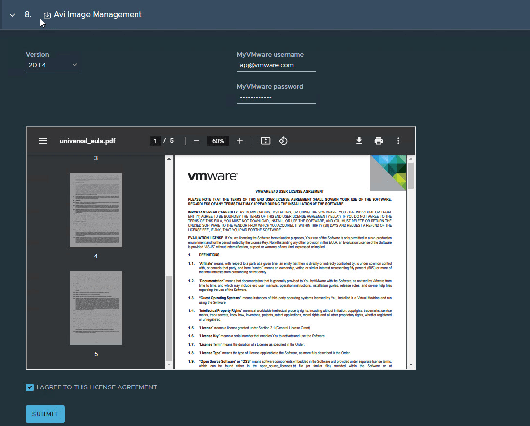 On the Avi Image management page, Accept EULA and hit submit button to start the deployment.