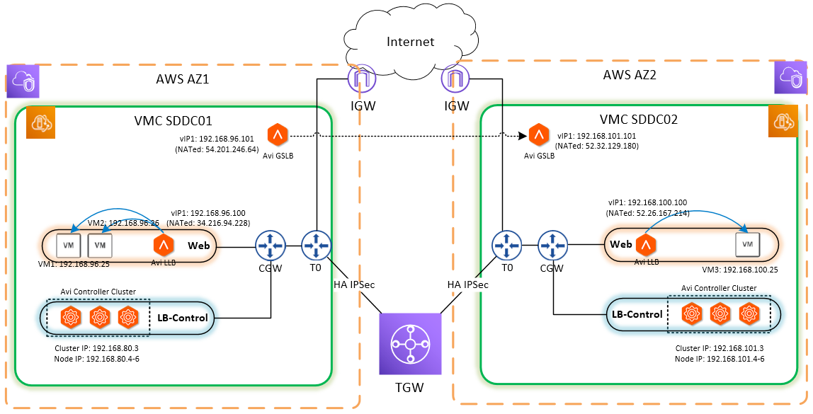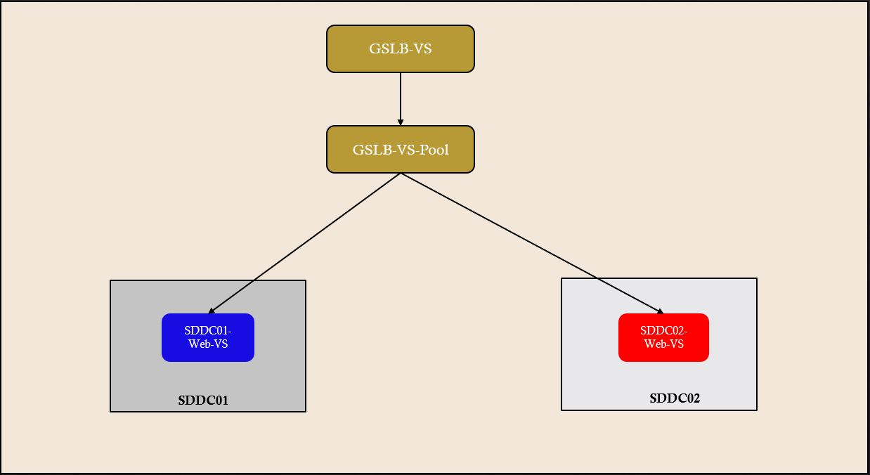 The below diagram taken from David Zhang’s blogshows a high-level topology of GSLB implementation across 2 SDDC (connected via vTGW) in VMC on AWS.