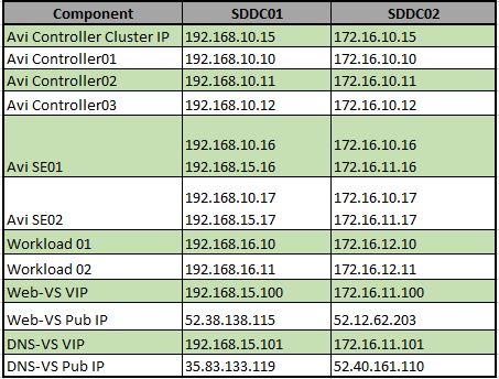 There are 2 SDDC’s running in VMC and both the SDDC has local load balancing configured to load balance set of web servers in their respective SDDC. The 2 Virtual Services (SDDC01-Web-VS & SDDC02-Web-VS) have a couple of web servers as pool members and the VIP of the Virtual Service is translating to Public IP via NAT.