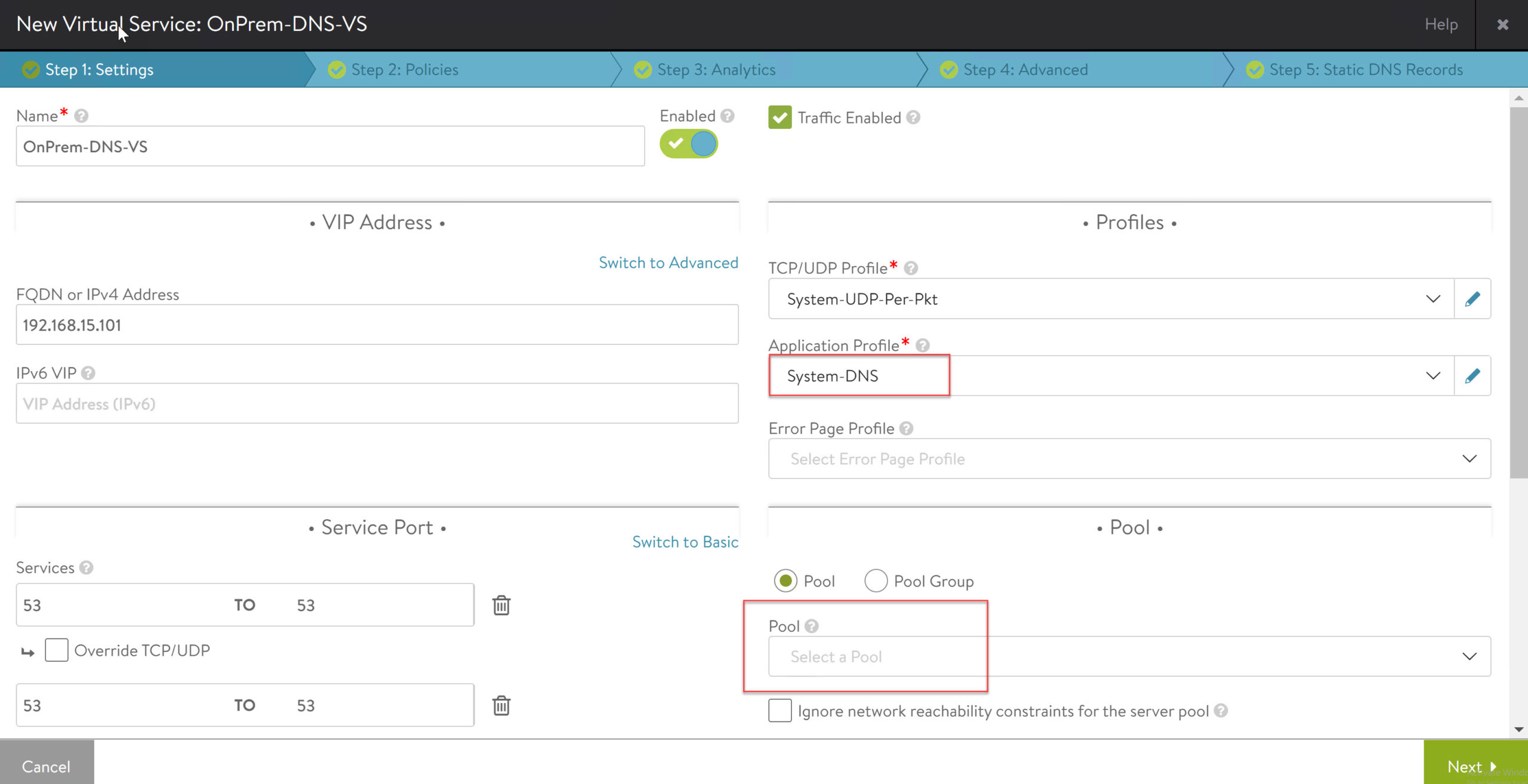 - Service Port: Select Port 53 by switching to advanced view under the Service Port sub-section.