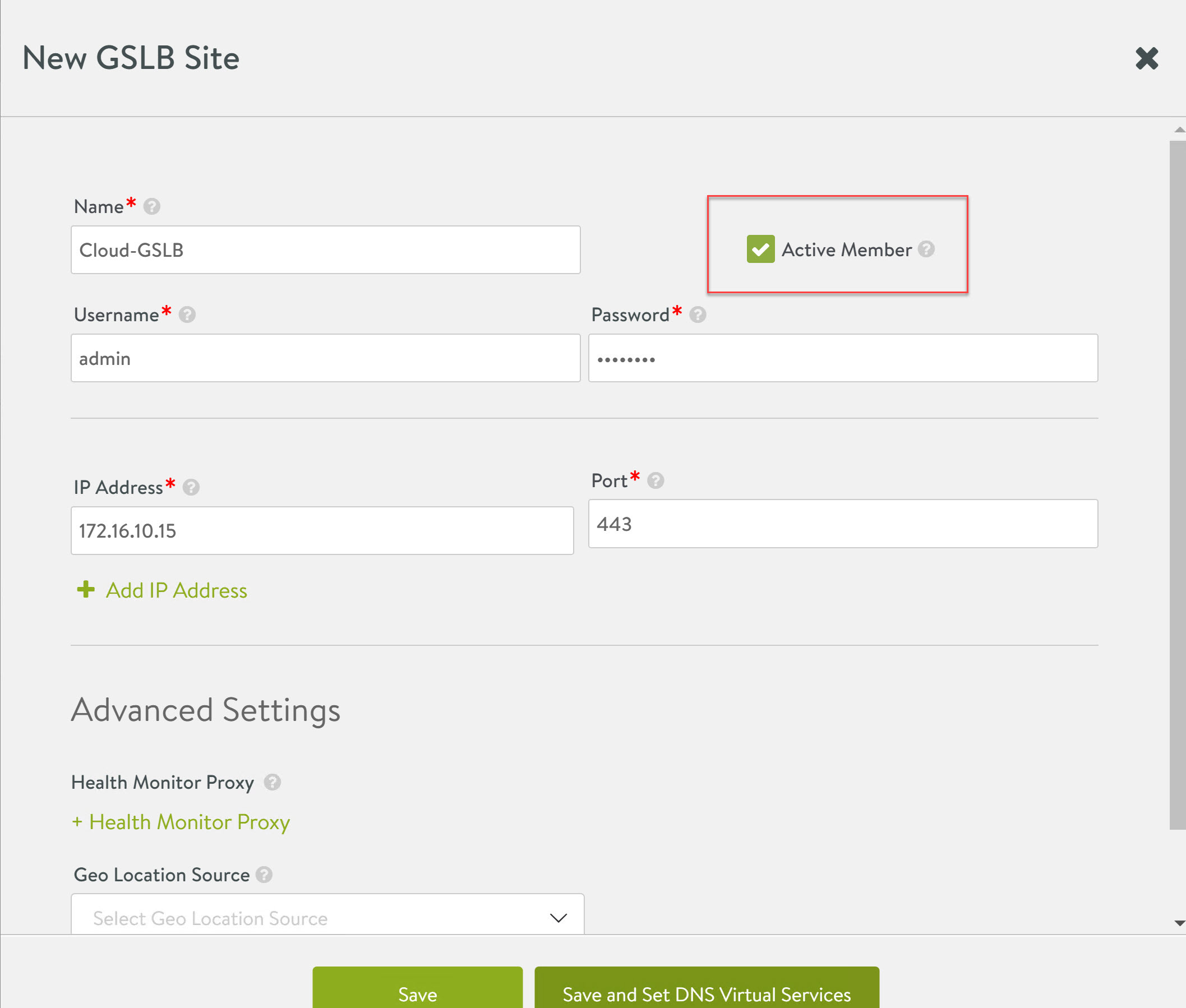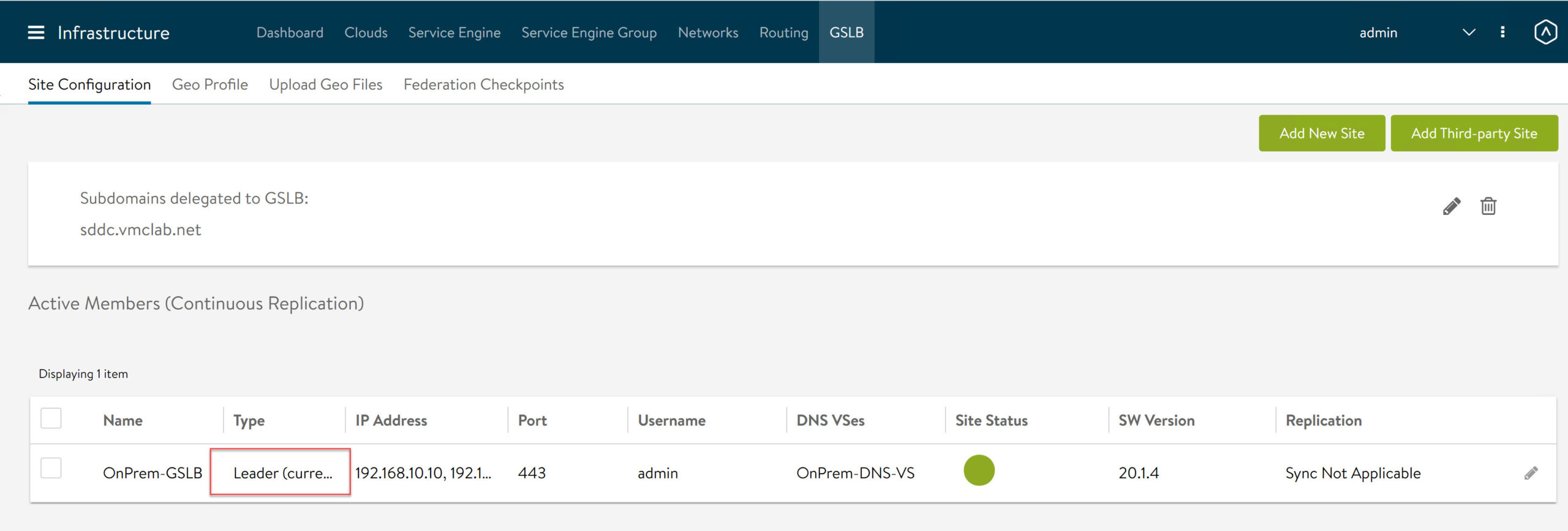 The first GSLB site is always added as Active and is designated with a Leader role. Subsequent sites can be added as Active or Passive depending upon the infrastructure needs.