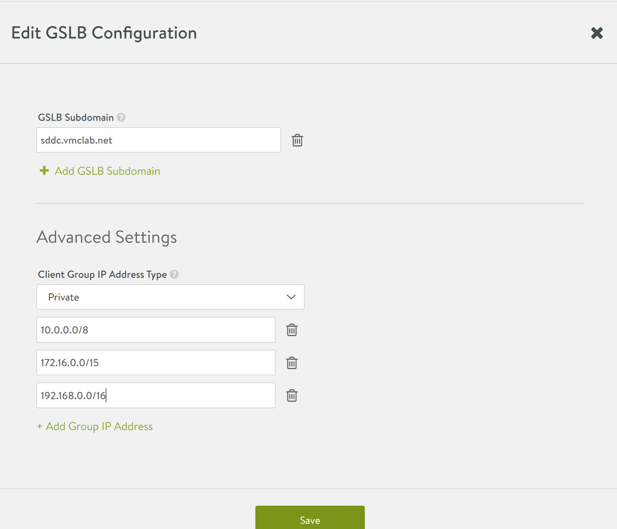 To configure this, navigate to Infrastructure > GSLB > Active Members and edit the settings of the Leader Site. Under Advanced Settings, select Client Group IP Address Type as Private and enter the following parameters: