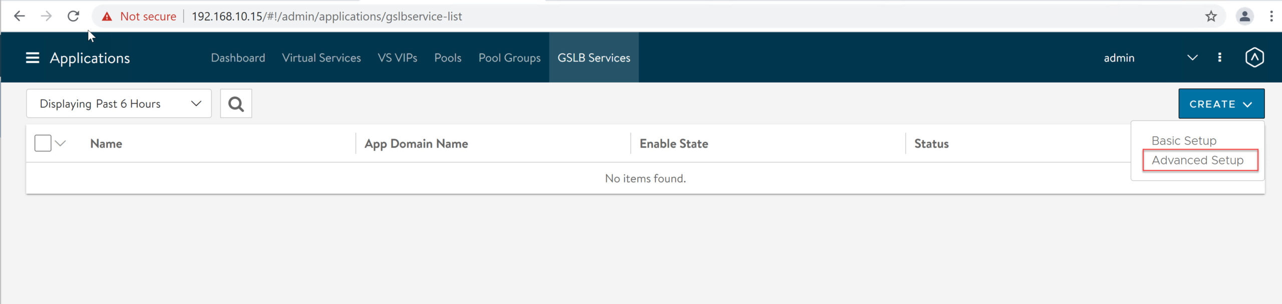 GSLB is a DNS based solution and is implemented via DNS Virtual Service. To create DNS Virtual Service, login to the Avi controller of SDDC1 and navigate to Applications > Virtual Services > Create Virtual Service > Advanced Setup.