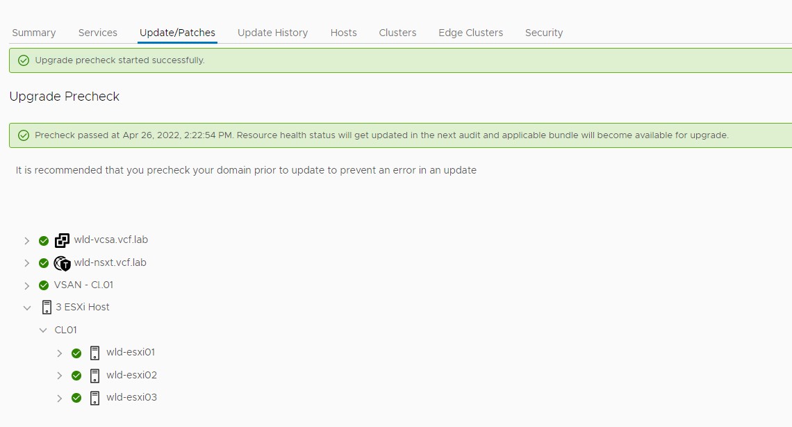 Before an upgrade bundle can be applied to a workload domain (Mgmt or VI), the SDDC manager trigger a precheck on the domain to identify and alert if there is an underlying issue, so that the issue can be remediated before applying the upgrade bundle. In lab environments, one of the common precheck failures is regarding the vSAN HCL compatibility.