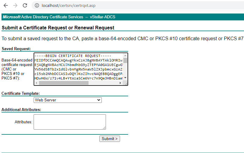 To sign the cert, paste the content of the alb.csr file into the saved request box and choose the ‘Web Server’ Certificate Template.