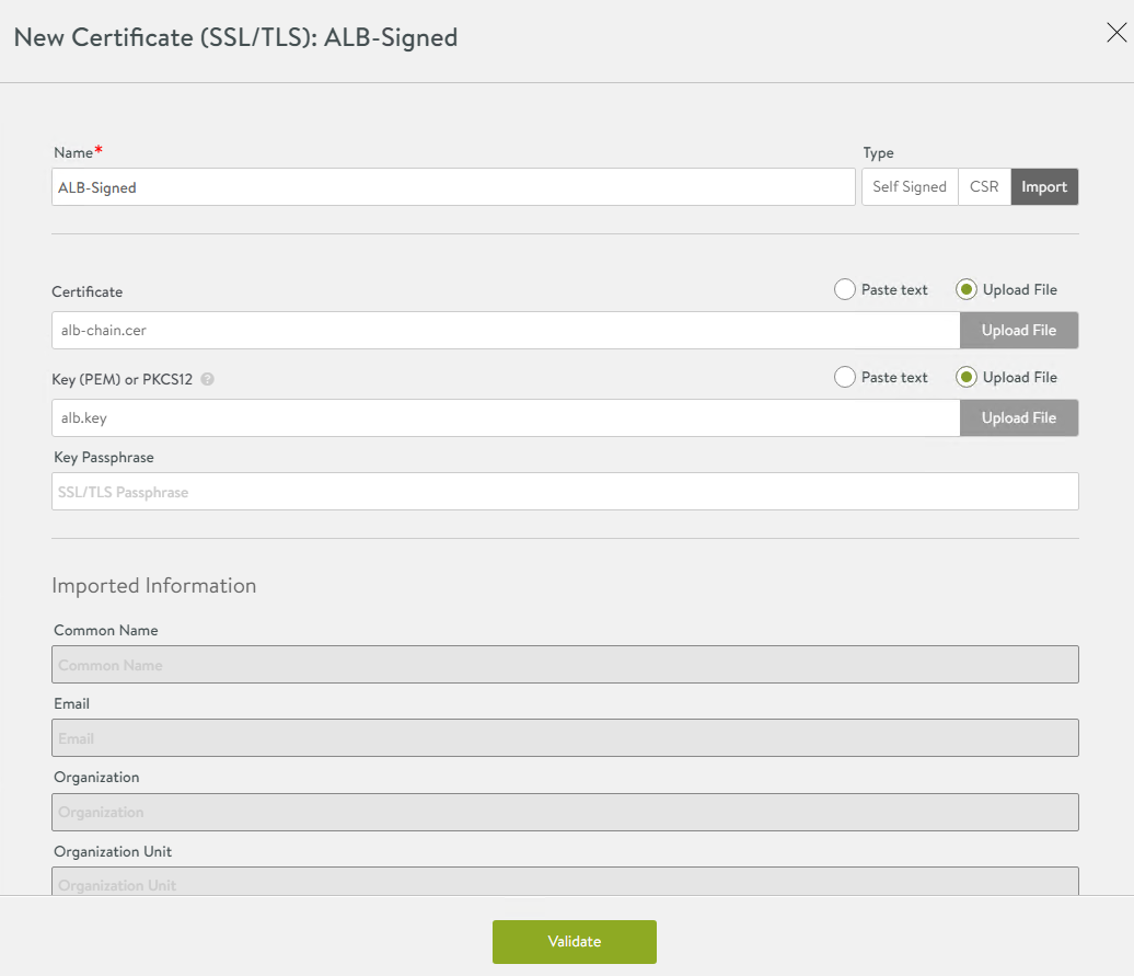 Under Certificate, place the .cer file, and under Key, place the private key that you generated in step 1.2. If you used a passphrase when generating the CSR, include it in the Key Passphrase.
