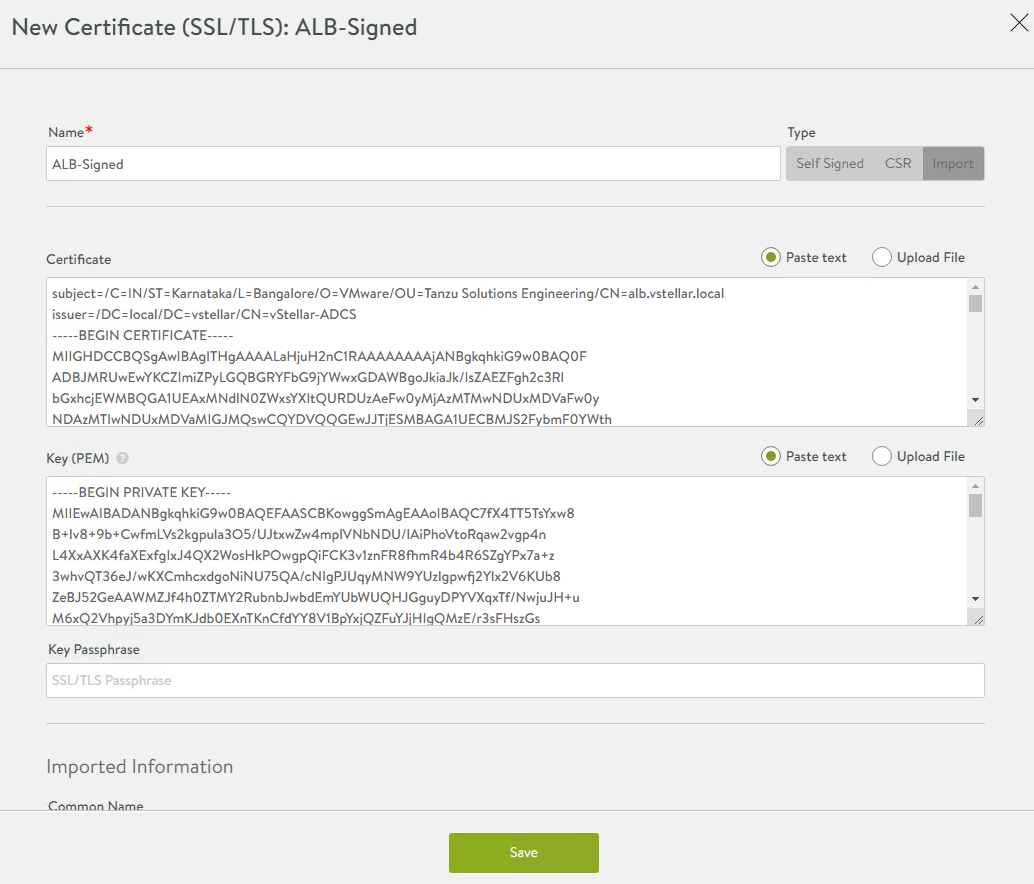 If the certificate is valid, the certificate and Key fields, as well as the certificate information, are filled in. To save the certificate, click the save button.