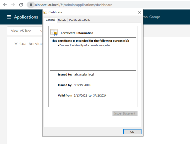 If you have imported your CA Server root certificate into the ‘Trusted Root Certification Authorities Certificate Store’ of the machine from which you access the NSX ALB portal, the certificate status will show Valid, and you can examine the Issuing Authority by clicking on the certificate.