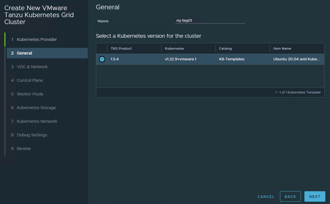 Choose the Kubernetes version and give the Kubernetes cluster a name. CSE 4.0 currently only supports TKGm 1.5.4.