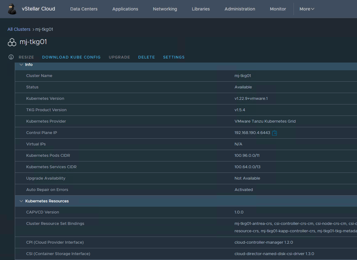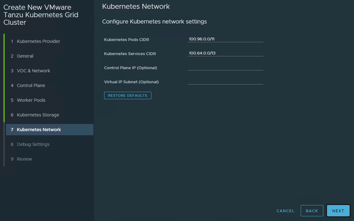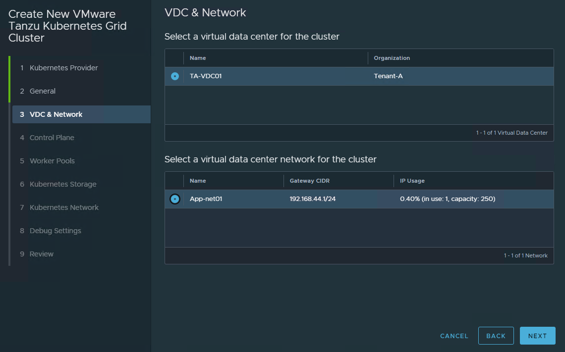 Choose the Virtual datacenter in which the Kubernetes cluster will be deployed, as well as the network to which the cluster will be connected. This network should have outbound internet connectivity.
