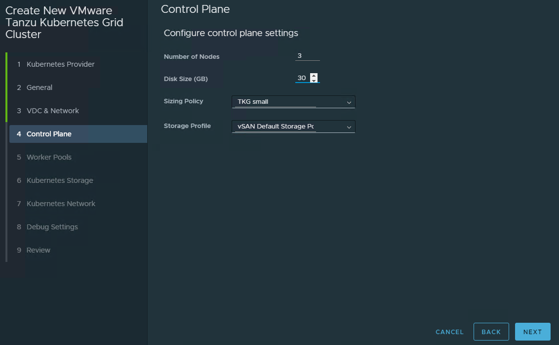 Select the number of worker nodes, disc size, and optionally, sizing and storage policies in the Control Plane window, then click Next.