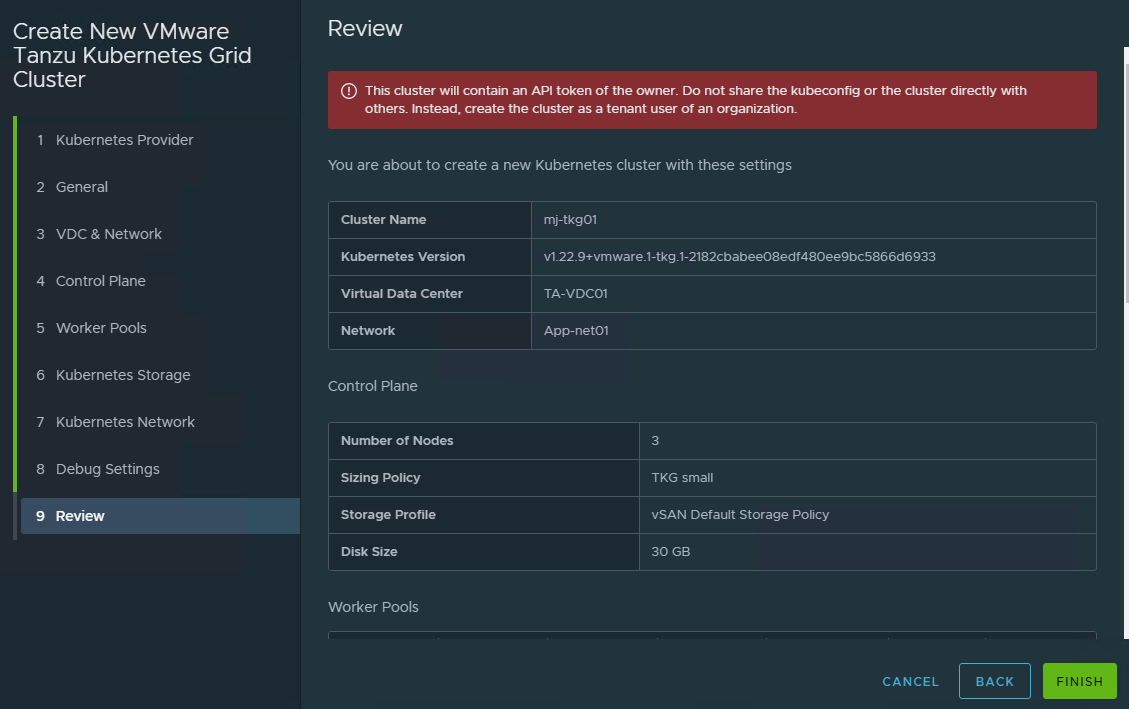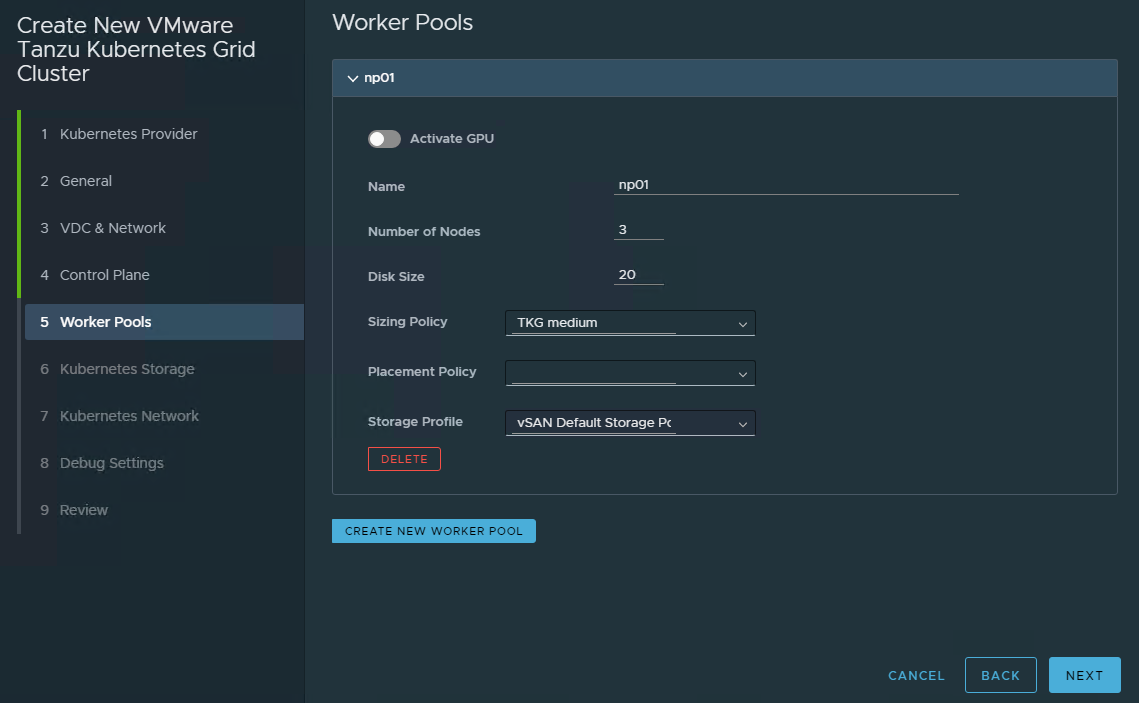 Enter a name, number of nodes, disc size, and optionally a sizing policy, placement policy, and storage policy for the worker nodes.
