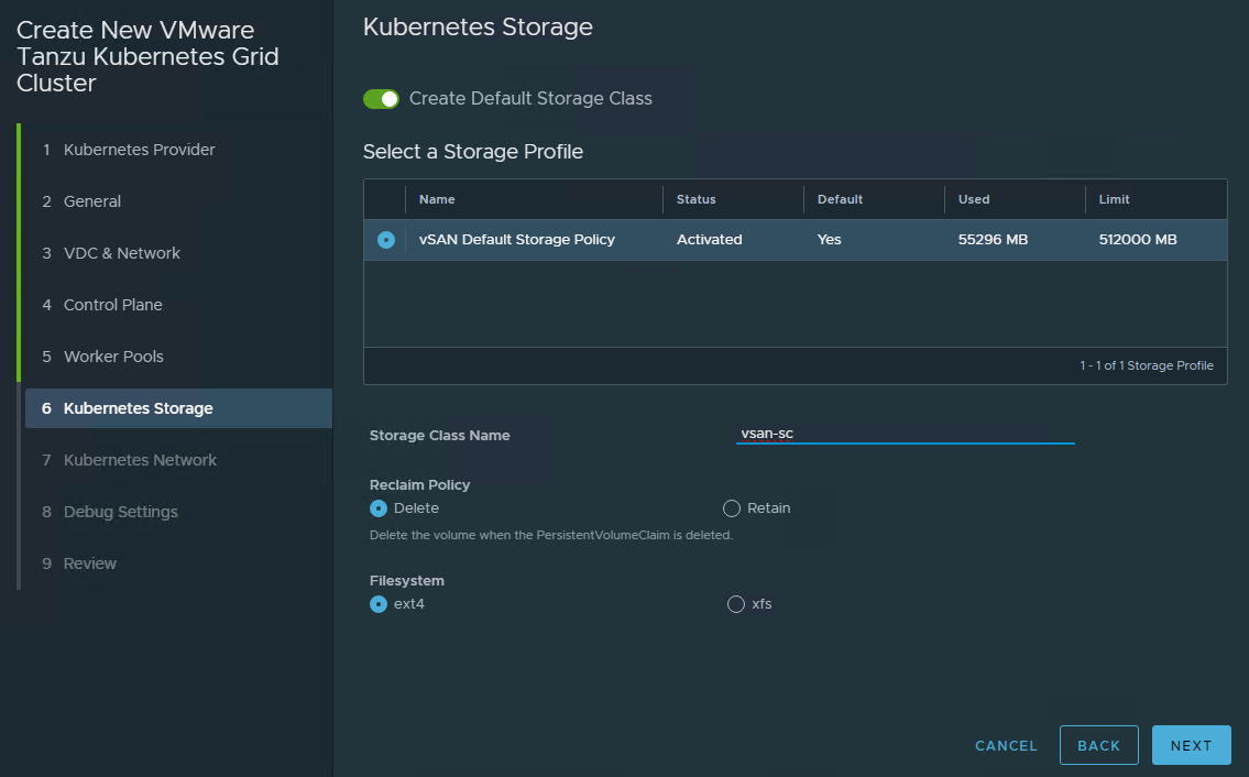 In the Kubernetes Storage window, activate the Create Default Storage Class toggle, select a storage profile, and enter a storage class name. Optionally you can configure Reclaim Policy and Filesystem settings.