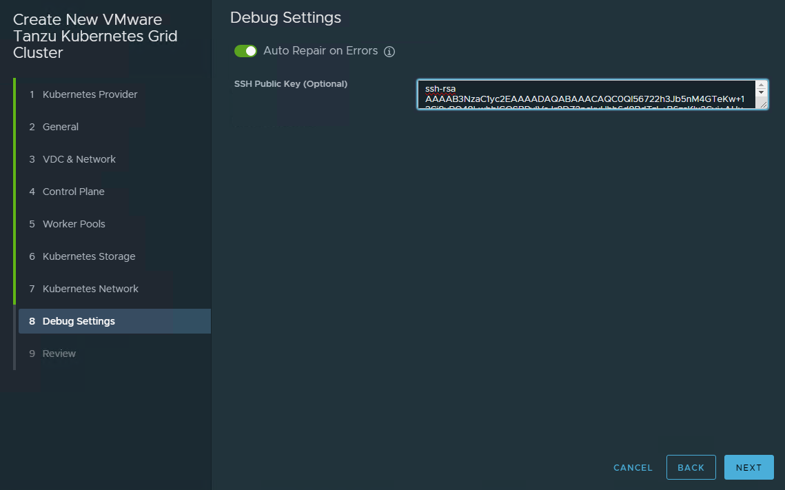 When this toggle is turned on, the CSE server attempts to recreate the clusters that are in an error state. When this toggle is deactivated, the CSE server leaves the cluster in an error state for manual troubleshooting.