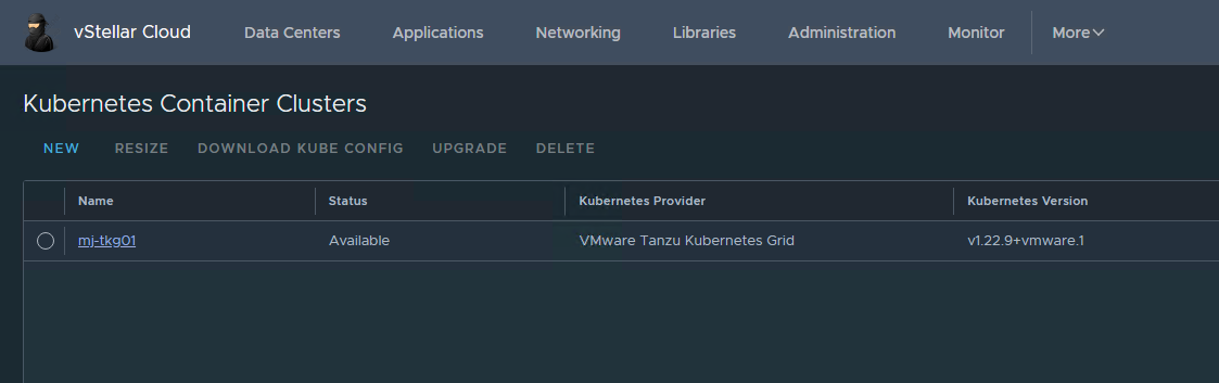 Log in to the tenant’s org to deploy a Kubernetes cluster. The user should be assigned the “Kubernetes Cluster Author” role. To begin with the cluster creation wizard, navigate to Home > More > Kubernetes Container Clusters and click the New button.