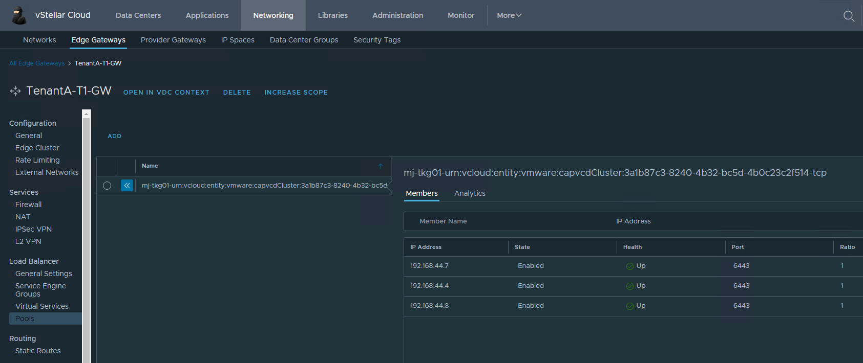 To see more information about the Load Balancer objects created during cluster deployment, navigate to the Load Balancer section by clicking on the Edge Gateway associated with the network configured in the Kubernetes cluster.