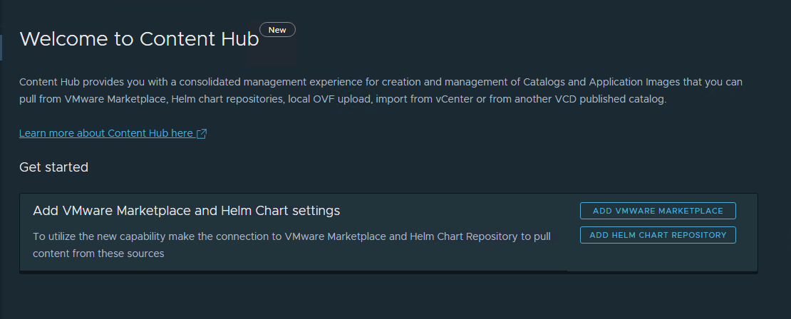Content Hub is an inbuilt feature of VCD that provides a unified interface to consume VM and container-based applications. It is an out-of-the-box feature and does not require installing any additional components. It merges the existing VMware Cloud Director Catalog and App Launchpad into a unified experience for tenants and providers. So you can think of VCD Content Hub as a replacement for the App Launchpad.The Content Hub feature effortlessly incorporates external content sources, such as VMware Marketplace and Helmchart Repositories, into the VCD environment.