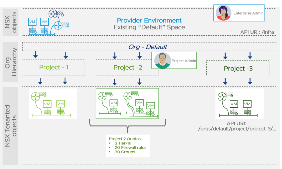 Before the introduction of projects, the NSX platform had a single space known as the default space, where the NSX Enterprise Administrator owned all networking and security configurations. With the introduction of multi-tenancy, the Enterprise Admin (Provider) segments the NSX platform into defined spaces called Projects, where each project represents a logical container of network and security resources (tenant).