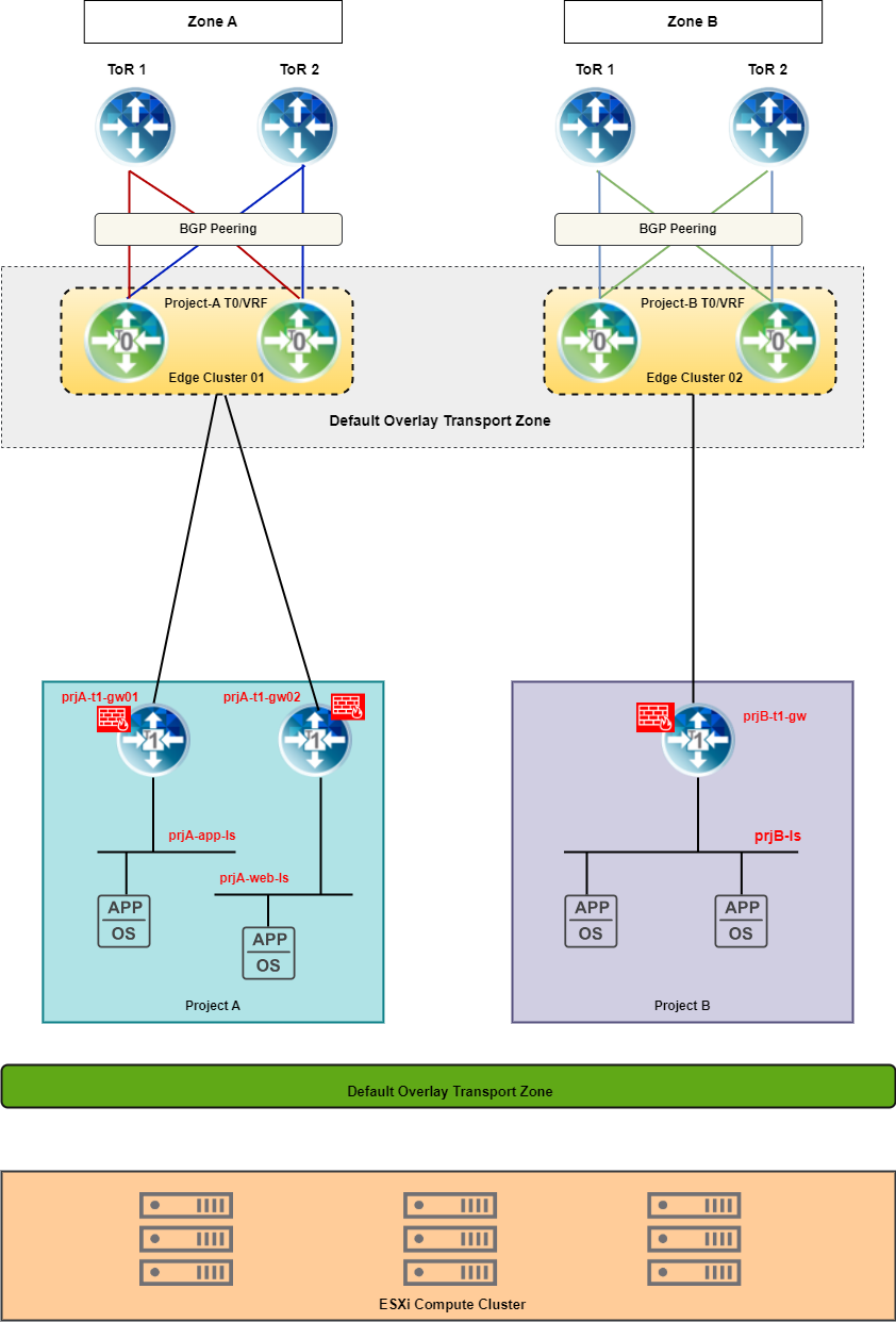 Since all transport nodes share the same transport zone, logical segments created inside any project are realized on all ESXi hosts that are part of the compute cluster prepared for NSX, but the segments are not visible across projects at the management plane level. Each tenant will be able to see only the segments created inside their projects.All tenant traffic will be routed through the same provider shared edge nodes and physical fabric to ensure N-S connectivity.