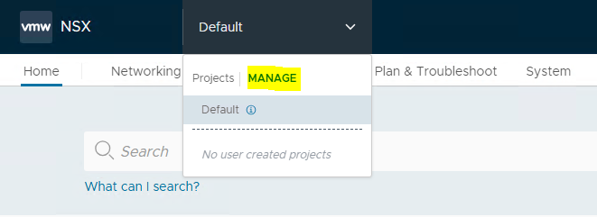 To create a new project, login to the NSX manager as an Enterprise Admin and click the Manage button in the default space drop-down menu.