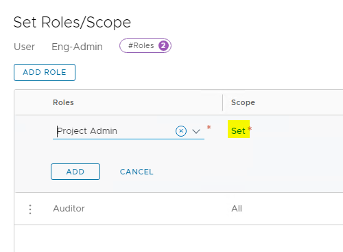 Select the Project Admin role and click on the set button to define the scope for this role.