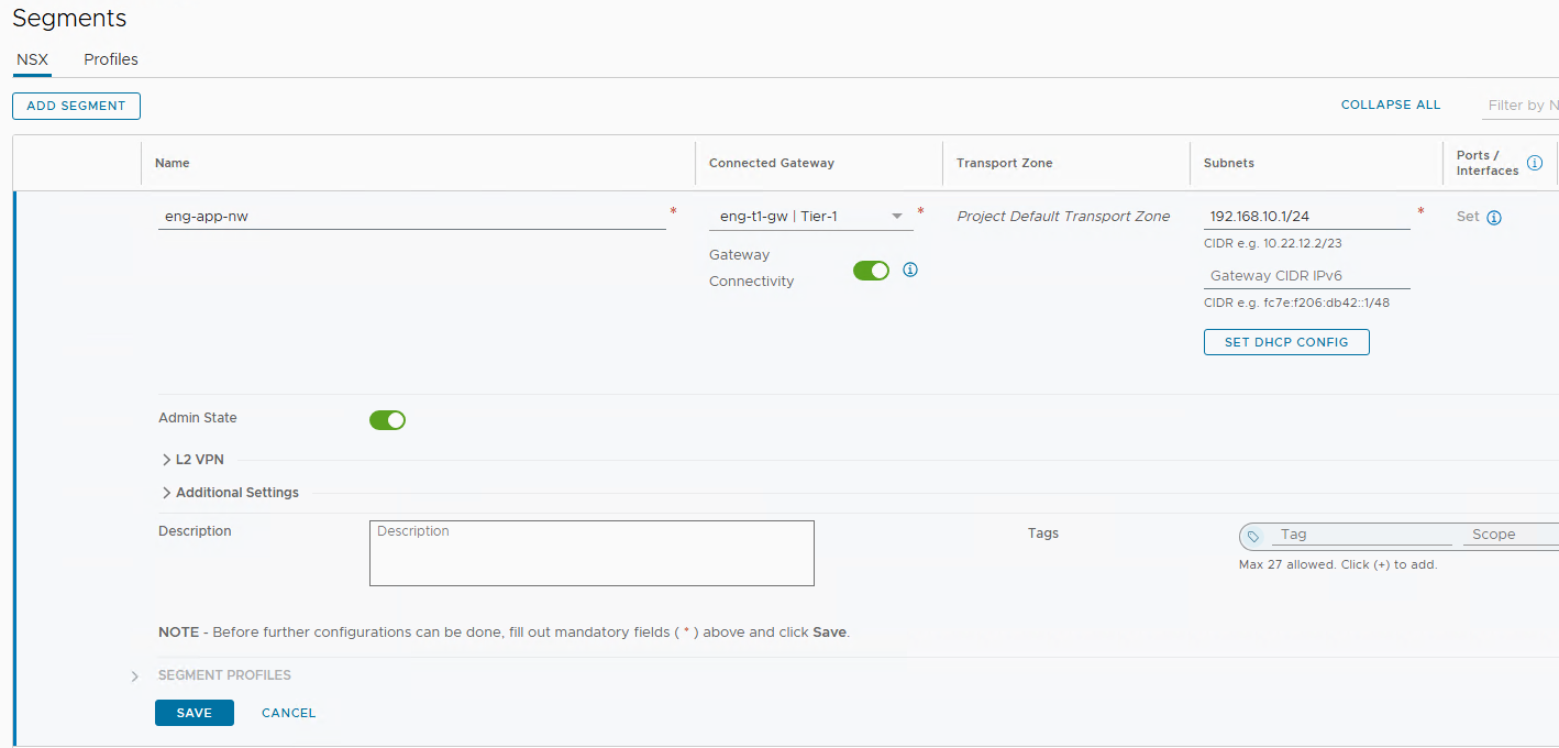 Create Project T1 Gateways & Segments