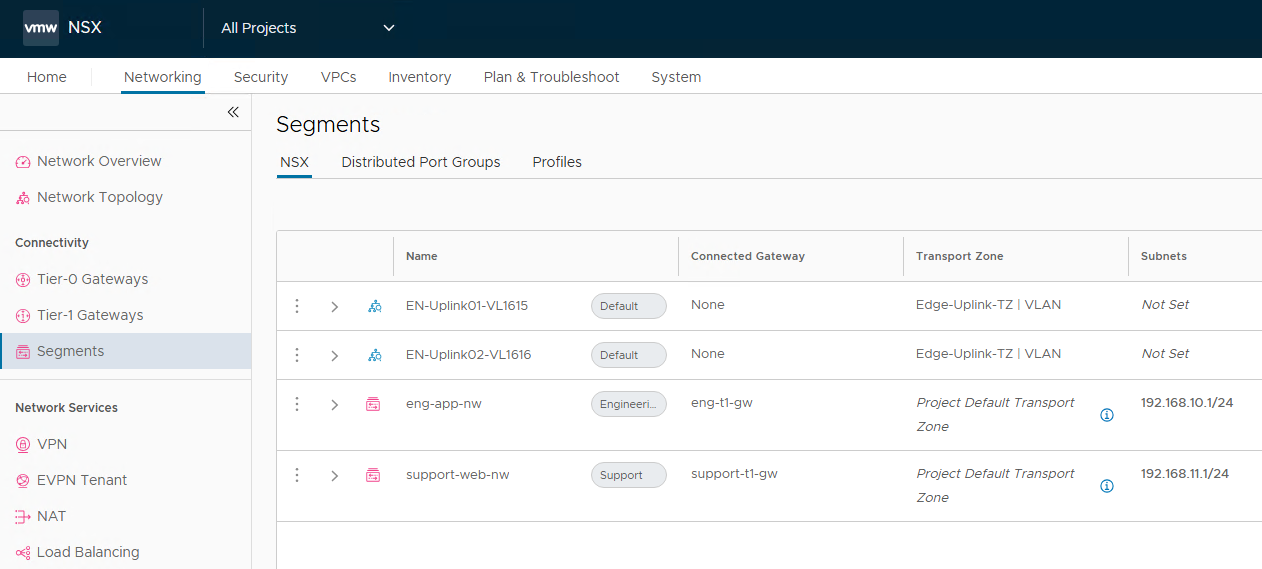Repeat the process to create additional tier-1 gateways and segments for the other projects in your environment.