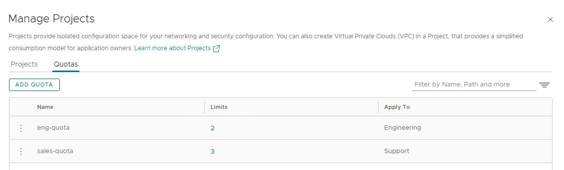 Quotas are assigned to the projects by the Enterprise Administrator. To configure quota policies, click on the Add Quota button.