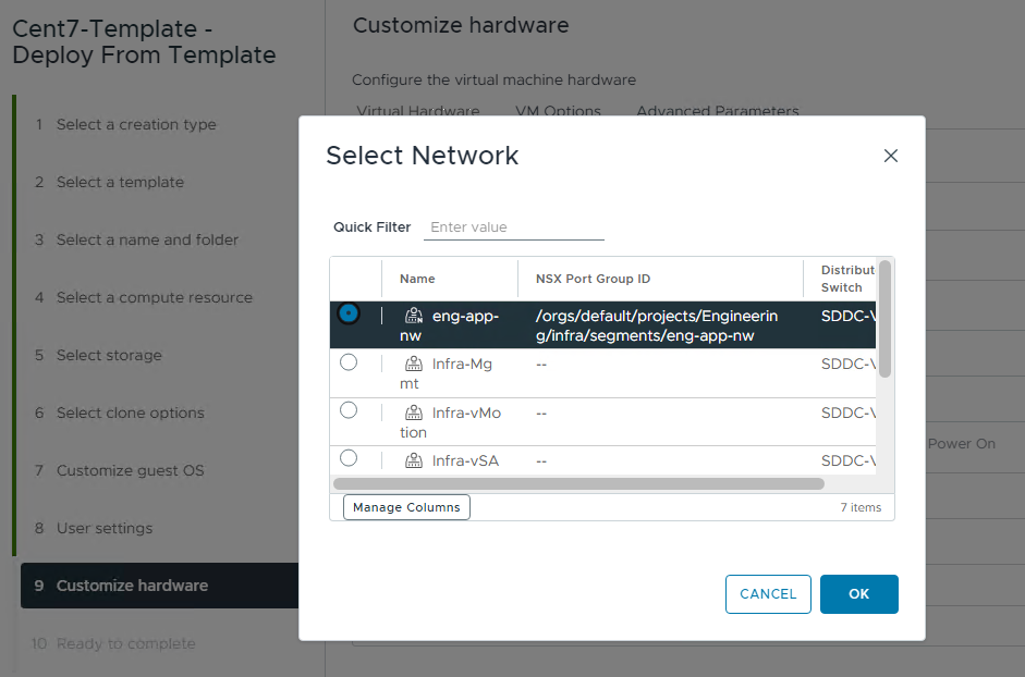 To verify the networking connectivity for the project’s vms, I deployed a VM each in the Engineering and the Support projects and connected the VM to the respective project segments.