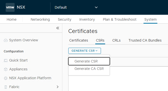 Login to the NSX manager node, navigate to System > Certificates > CSRs, and click Generate CSR.