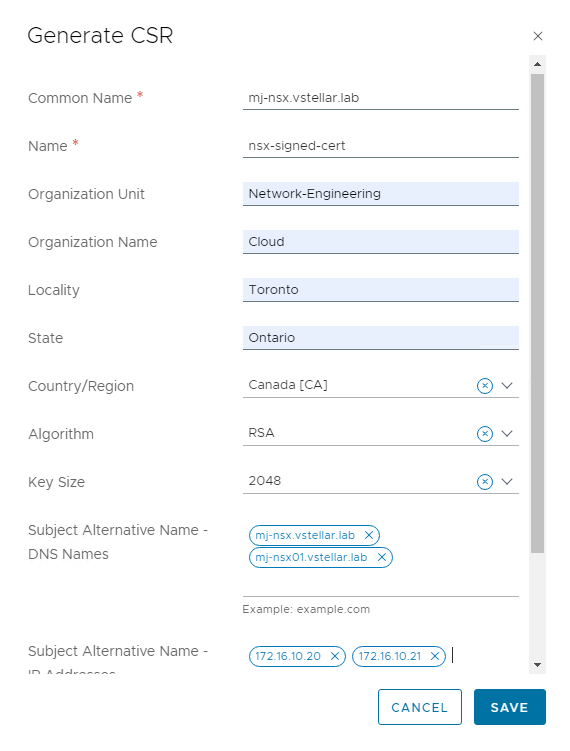 Enter the common name, DNS names of the NSX manager nodes/VIP, and the corresponding IP addresses.