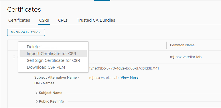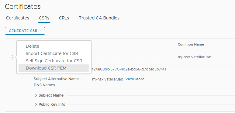 In the NSX Manager UI, navigate to System > Certificates > CSRs and locate the CSR generated in step-1.