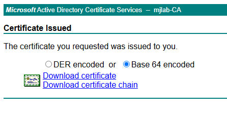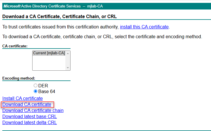 Return to the home page of the certificate authority server and download the CA root certificate by clicking “Download a CA Certificate, Certificate Chain, or CRL.”