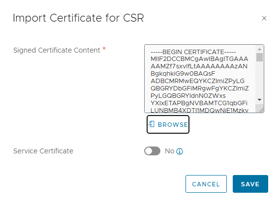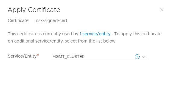 To apply the certificate to the NSX Cluster VIP, set the Service/Entity to MGMT_CLUSTER and click Save.