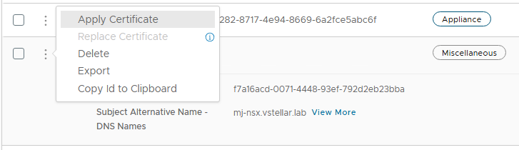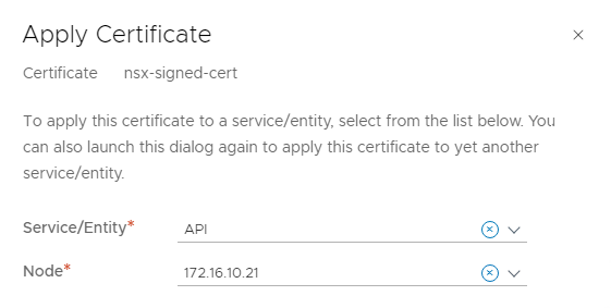 To apply the certificate to the NSX node, set the entity to API and select the node. This needs to be done for all NSX nodes.