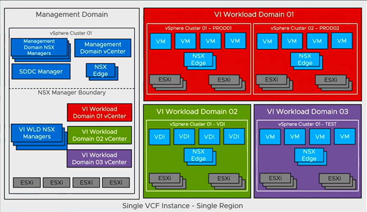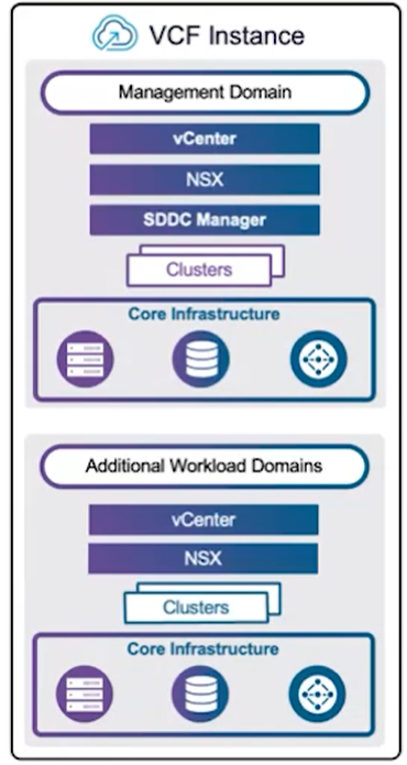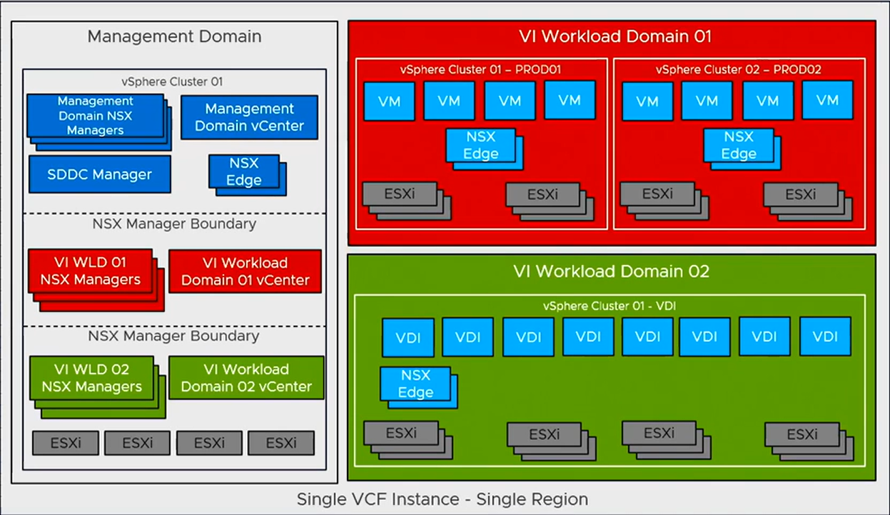 Each domain has dedicated vCenter and NSX managers and has isolated networking and storage constructs. This architecture is referred to as the VCF standard architecture.