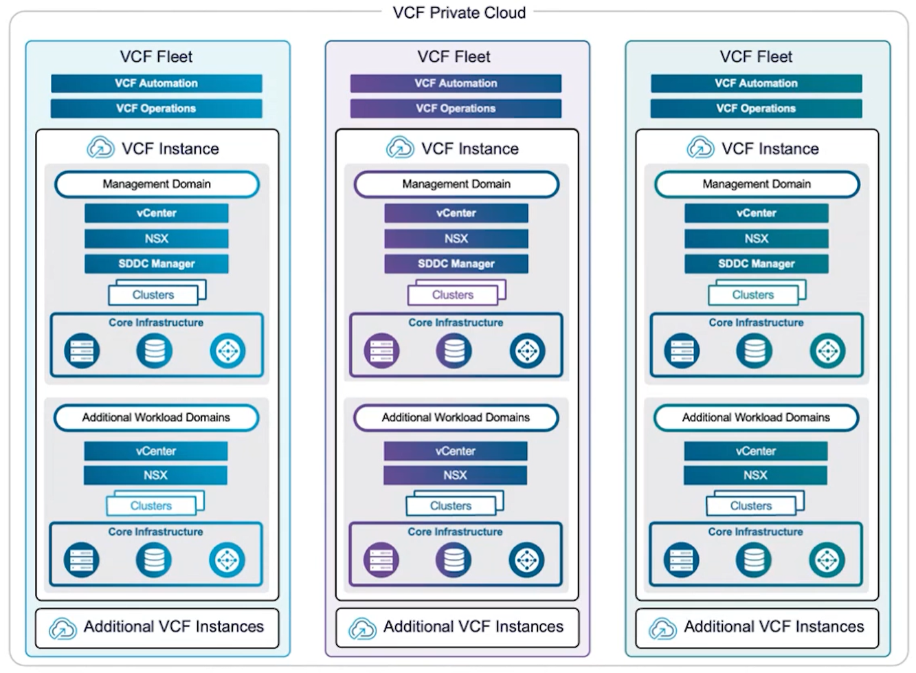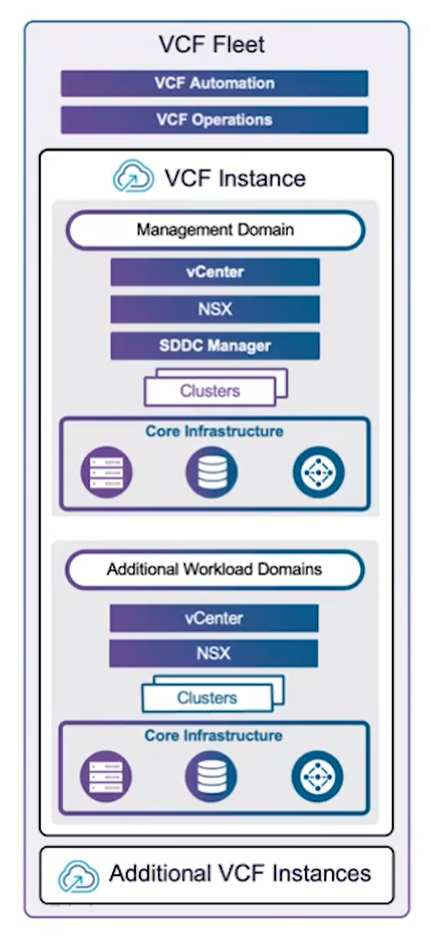VCF-9 introduced a new component called VCF fleet in the VCF ecosystem. A VCF fleet is a collection of one or more VCF instances. A VCF fleet also includes 2 additional components: VCF operations and VCF automation. The fleet components are intended to span across VCF instances. You can have a single VCF operations and automation instance managing multiple VCF instances.